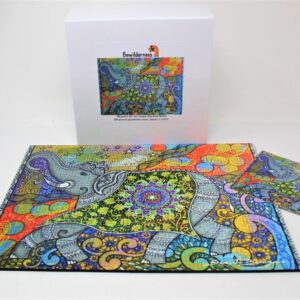 This majestic elephant trumpets in delight in the midst of an intricate and colorful pattern across the entire puzzle. We can’t get enough of Deepti Agrawal Mittal’s gorgeous work! She specializes in Madhubani Painting, a folk art from the eastern Indian state of Bihar. We’re proud to be able to bring Deepti’s work to you in puzzle form.
