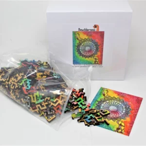 This wooden jigsaw puzzle is cut with our very own geometric piece design, featuring a colorful background with an inked mandala. It’s laser cut from high-quality 3/16″ birch and basswood ply. This 326-piece puzzle is the most difficult one we make! With the straight-edge geometric cuts, you can’t just start with the border and work your way in, and the pattern of the painting adds another layer of complexity.
